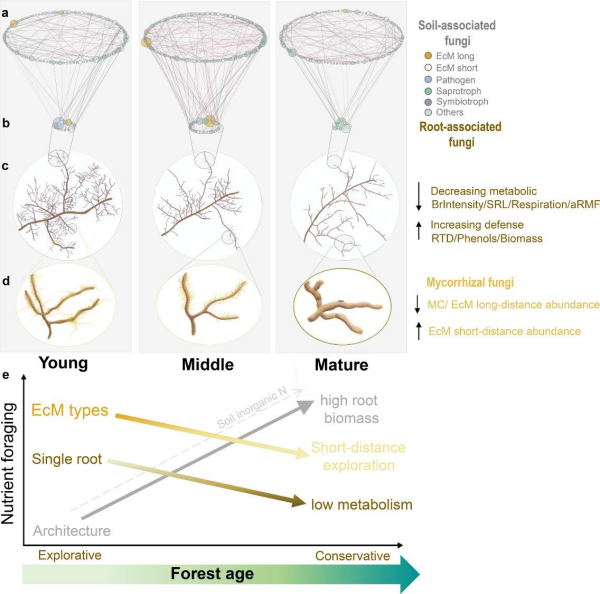 结果显示林龄主导了落叶松“吸收根-菌根真菌”养分觅食连续体的从“获取型-保守型”转变。从幼龄林到成熟林,根系结构、菌根真菌探索类型与土壤真菌的组合呈现系统性的差异。