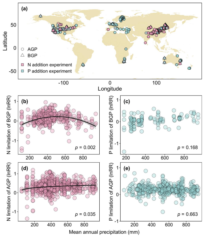 图 1.| 数据来源以及年均降水量(MAP)与草原生产力养分限制的关系。(a) 全球分析纳入实验点的地理分布。(b–e) MAP 与(b)地下生产力(BGP)氮限制、(c)BGP 磷限制、(d)地上生产力(AGP)氮限制与(e)AGP 磷限制之间的偏回归关系。养分限制强度采用生产力对氮或磷添加处理的自然对数响应比(lnRR)来量化。