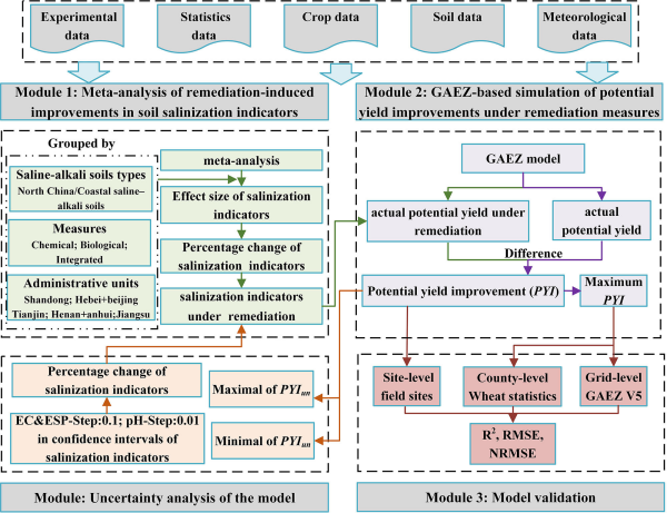 近日,史文娇课题组在《Agricultural Systems》发表文章,系统构建了盐碱地改良后,小麦潜在产量提升的空间评估框架。该研究以我国黄淮海区为例,将评估作物潜在产量的全球农业生态区划(GAEZ)模型与改良后土壤盐碱指标变化的实验数据进行耦合,实现了区域尺度盐碱地改良产能提升潜力的空间精细尺度量化评估。