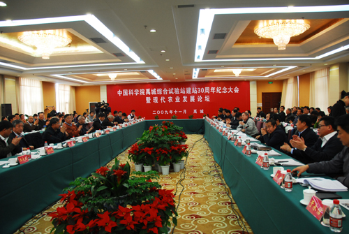 2009年11月18日至19日,中国科学院禹城综合试验站30周年纪念大会暨现代农业发展论坛在山东省禹城市举行。中国科学院原副院长、中国科学院院士孙鸿烈,中国气象局原局长、全国政协人口资源环境委员会副主任、中国科学院院士秦大河,农业部规划设计研究院副院长、致公党中央副主席、全国人大常委杨邦杰,中国科学院资源环境科学与技术局原局长刘安国、副局长冯仁国,中国科学院农业项目办公室副主任王大生,中国科学院地理科学与资源研究所所长刘毅、副所长于贵瑞,山东省科技厅厅长翟鲁宁,省农业开发办主任曹云龙,中科院沈阳分院院长助理、省科技厅副厅长王晓斌,省气象局副局长沈建国,山东省德州市市委书记、市人大常委会主任雷建国,市委常委、秘书长满春重,副市长韩建亭,禹城市市委书记黄金忠,禹城市市委副书记、市长阎剑波等领导出席会议。来自中国科学院、中国农业大学、中国农科院、山东省科技厅、山东省气象局、山东农业大学、山东省农科院、新疆农垦科学院等科研机构与院校,以及山东省东营市科技局、聊城市高新区、登海种业的120多位专家学者参加了会议。
