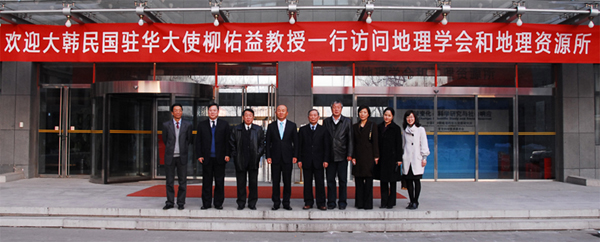 2010年1月15日下午,大韩民国新任驻华大使柳佑益教授一行访问了中国地理学会和中国科学院地理科学与资源研究所。中国地理学会理事长陆大道院士、国际地理联合会(IGU)原副主席刘昌明院士、中国科学院地理科学与资源研究所所长刘毅研究员、中国地理学会对应IGU委员会主席王五一研究员、中国地理学会秘书长张国友研究员、中国科学院地理科学与资源研究所副处长孙樱副研究员等接待了柳大使一行。