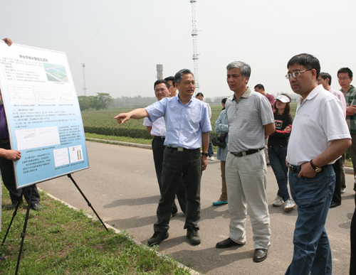 丁仲礼一行实地考察了禹城站的农田土壤微生物调控长期试验场、保护性耕作长期试验场、养分平衡长期试验场、小麦高产试验、农田增温试验平台、陆地水面增发场等场地和设施,详细询问了超级小麦和1.2吨粮田建设问题,实地勘察了高产种植品种与当地普遍种植品种的差异性,考察了白三叶、紫花苜蓿和串叶松香草等牧草产量,并对它们的需水量状况进行了探讨,希望禹城站继续加强在土壤水分蒸散方面的研究,针对“全球变化与农业”这一命题进行探讨。
