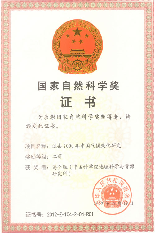 “过去2000年中国气候变化研究”获2012年度国家自然科学奖二等奖