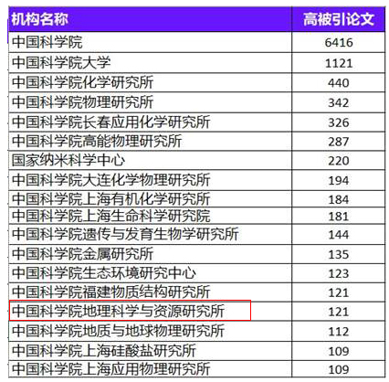 在高被引论文产出方面,地理资源所发表的高被引论文达到121篇,比2018年增加21篇,稳居中国科学院“百篇高被引论文俱乐部”行列(全院共18家)。从此次入选的18家院属机构来看,地理资源所连续2年位居地学领域院属机构第一位,地质地球所排名二;而在资源环境领域,也仅有生态环境研究中心、地理资源所2家机构入选。
