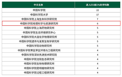 2019年11月15日,科睿唯安发布了最新一期的基本科学指标数据库(Essential Science Indicators,以下简称“ESI”)数据(覆盖时段为2009年1月1日至2019年8月31日)。据统计,中国科学院地理科学与资源研究所进入ESI排名前1%学科数6个,位居中国科学院院属机构第三位。6个学科分别是“地球科学”、“环境科学与生态学”、“农业科学”、“社会科学”、“工程学”及“植物与动物科学”。