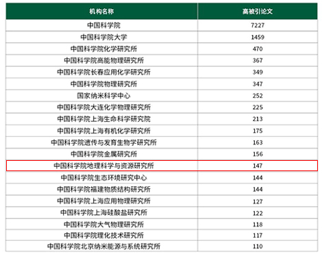在高被引论文产出方面,地理资源所发表的高被引论文达到147篇,比2019年初统计增加26篇(排名上升2位),稳居中国科学院“百篇高被引论文俱乐部”行列(全院共19家)。从此次入选的19家院属机构来看,地理资源所自2018年以来持续位居地学领域院属机构第一位;在资源环境领域,同时入选的还有生态环境研究中心、大气物理所2家机构。
