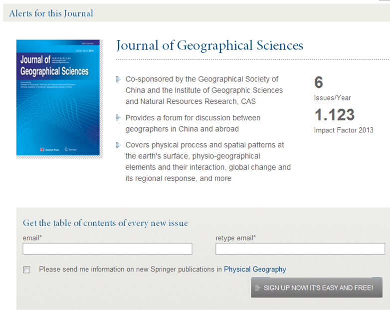 Springer出版社同时开通了期刊目次提醒服务,如果您想及时了解《地理学报(英文版)》的最新进展和内容,可注册《地理学报(英文版)》的目次提醒服务。注册流程非常简单,只需输入email地址即可。