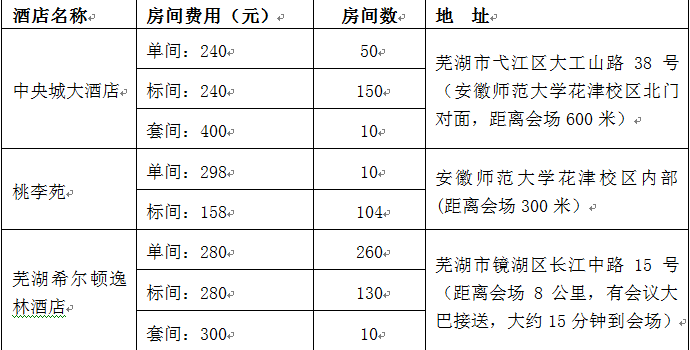 公交线路:从火车站乘10路公交车至中央城站下车,向东步行约300米至中央城大酒店;从火车站乘10路公交车至马场村站下车,从安徽师范大学花津校区西北门进入校园内,步行约200米至桃李苑大酒店。
