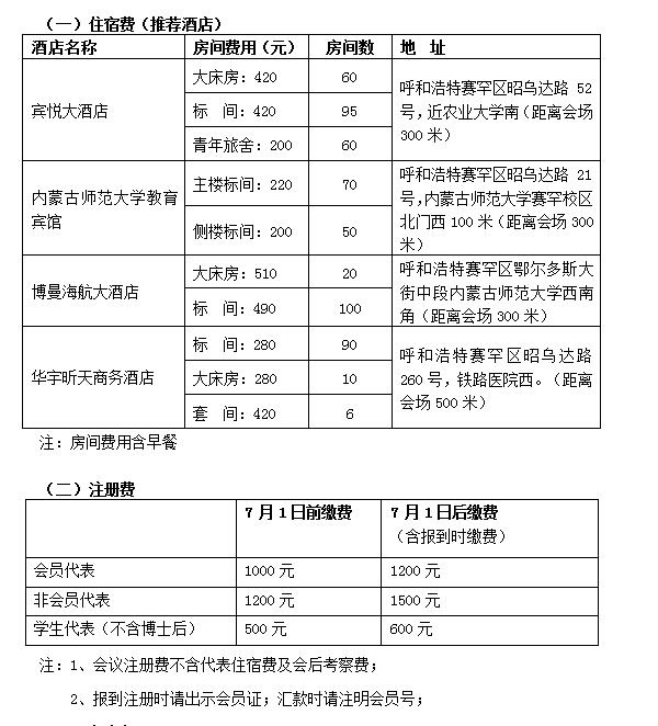 5.参加七届四次理事会及全国资源学院院长论坛的代表建议选择宾悦大酒店入住;参加全国资源科学研究生论坛的代表建议选择内蒙古师范大学教育宾馆入住。