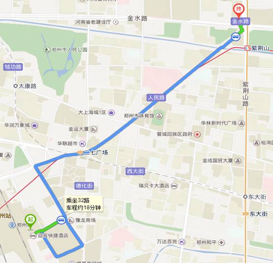 公交:乘坐32路公交车,车程约35分钟,火车站上车,紫荆山人民路站下车,步行220米到达河南饭店(花园路店)。