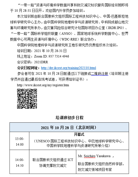 “一带一路”资源与环境科学数据共享和防灾减灾知识服务国际培训班通知