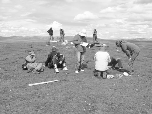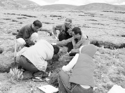 研究人员在三江源地区玉树县上拉秀乡玛龙村草地进行光合作用测定和土壤样品采集。