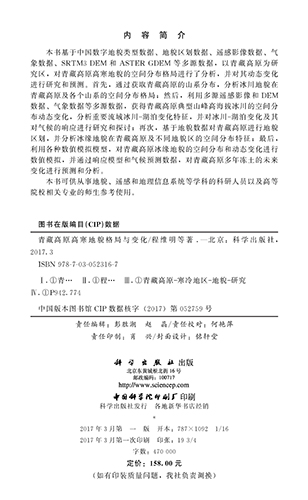 该书基于中国数字地貌类型、地貌区划、遥感影像、气象、SRTM3-DEM和ASTER-GDEM等多源数据,对青藏高原高寒地貌的空间分布格局进行了分析,并对其动态变化进行研究和预测;分析冰川地貌在青藏高原及各个山系的空间分布格局,获得青藏高原典型山峰高海拔冰川的空间分布动态变化,分析重要流域冰川湖泊变化特征,并对冰川湖泊变化及其对气候的响应进行研究和探讨。基于地貌类型数据对青藏高原进行地貌区划,分析了冰缘地貌在青藏高原及不同地貌区的空间分布特征;利用多种数值模拟模型,对青藏高原冰缘地貌的空间分布和动态变化进行数值模拟,并通过响应模型和气候预测数据,对青藏高原多年冻土的未来变化进行预测和分析。