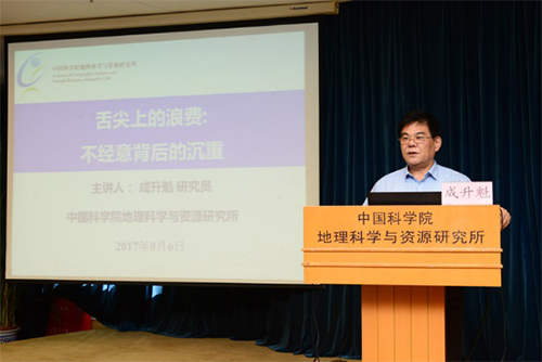 讲座邀请中科院重点部署项目“新时期国民营养与粮食安全”的首席科学家、中国自然资源学会理事长、地理资源所研究员成升魁,作了主题为“杜绝舌尖上的浪费:不经意背后的沉重”的报告。他以第一手调研数据为支撑,用通俗的语言和生动的案例,从全球食物浪费入手,聚焦我国餐饮业,深入剖析谁浪费、浪费多少、为什么浪费,并进一步指出浪费的影响是不可承受之重,遏制食物浪费事关国家持续发展,对于推动生态文明建设具有重大意义。