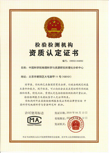 地理资源所理化分析中心(以下简称“中心”)于2018年3月顺利通过资质认定评审专家的现场评审。2018年4月13日,中国国家认证认可监督管理委员会正式为地理资源所理化分析中心颁发资质认定证书(CMA,China Metrology Accreditation中国计量认证),证书编号:180021164092,有效日期:2024年4月12日。