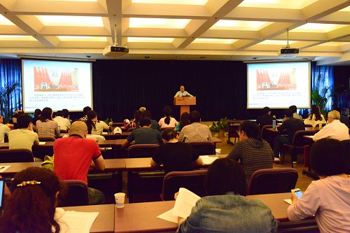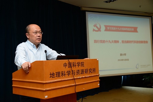 为深入学习贯彻党的十九大精神,推动“两学一做”学习教育常态化制度化,5月8日,地理资源所举办学习党的十九大精神专题党课报告会,由党委书记廖小罕同志讲授题为《践行党的十九大精神,担当新时代科技创新使命》的专题党课。党委副书记高春东同志和全所各党支部书记、委员近80人参加党课学习。