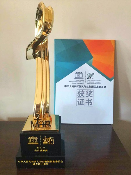 大会为表彰在中国人与生物圈国家委员会40年实践与发展过程中甘于奉献的科研人员、保护地工作者及企业家,特别设置了“中国人与生物圈国家委员会成立40周年杰出贡献奖”,李文华院士作为科研人员代表荣获此项殊荣。40年来,李文华院士一直致力推动联合国教科文组织“人与生物圈计划”在中国的推广和实施,曾担任两届人与生物圈计划国际协调理事会主席和执行局主席,在国际上积极介绍推广中国人与生物圈工作的成果与经验,扩大了我国生态保护工作在国际上的影响。
