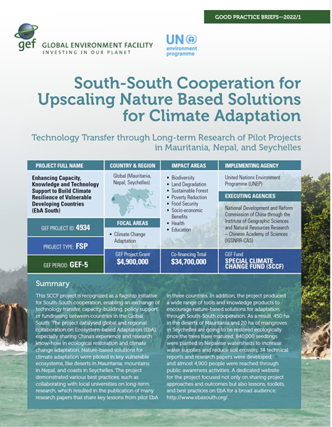 该项目由GEF气候变化特别基金(SCCF)资助,作为南南合作的一项旗舰举措,促进了非洲和亚太地区发展中国家间在技术迁移、能力建设、政策支持和资金筹措方面的交流。该项目由联合国环境规划署(UNEP)负责实施,中国国家发展和改革委员会委托中国科学院地理科学与资源研究所执行,并且促进了全球与地区间在EbA领域的合作,分享了中国在生态恢复和适应气候变化方面的经验和研究成果。在各类关键脆弱生态系统中试点了基于自然的气候适应解决方案,包括毛里塔尼亚沙漠区、尼泊尔山区、塞舌尔的海岸带。在试点国家及其他地区(包括Mekong EbA South)均产生了积极影响。