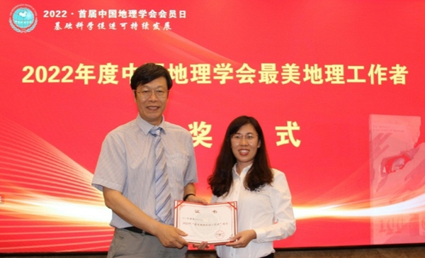 付晶莹作为中科院青年地理工作者、中国地理学会会员、中科院青年创新促进会会员,在科研工作中具有新时代青年科学家的创新精神,在地理大数据与可持续发展领域开展了扎实的科研工作。同时,把科学技术应用于社会实践,把论文写在家乡的大地上,积极推动家乡吉林磐石“优质地理产品与生态环境可持续发展”工作,争做“地理科学家回故里,才智贡献家乡”先锋。此次被评选为“最美地理科技工作者”,是对她前期工作的充分肯定。中国地理学会理事长陈发虎院士为其颁发了证书。