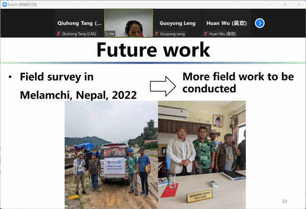 项目组成员徐锡蒙副研究员做了题为“恒河-雅鲁藏布江-梅格纳河流域洪水监测服务”的主旨演讲,主要介绍了构建的恒雅梅流域洪旱风险信息服务系统,该系统能面向孟加拉、尼泊尔、印度等国家准实时提供流域土壤干旱、洪水淹没深度和洪水重现期等灾害信息服务;贺莉副研究员做了题为“恒河-雅鲁藏布江-梅格纳河流域洪水灾害及其适应性策略”的主旨演讲,主要介绍了尼泊尔迈拉目齐(Melamchi)地区2021年洪水灾害的现场调研和成灾分析,成果揭示了尼泊尔地区不同类型洪水灾害的成因,提出了因地制宜的适应性策略。