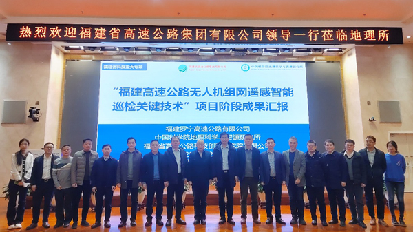 2月2日下午,福建省高速公路集团有限公司党委书记、董事长陈岳峰一行6人莅临地理资源所,双方就高速公路无人机组网遥感智能巡检关键技术研究项目情况开展了交流研讨。随行人员有公司副总经理陈礼彪、公司战略发展部总经理张善金、公司建设管理部林志平总经理、福建省高速公路科技创新研究院有限公司总经理曾俊铖及公司驻京办主任郑威。地理资源所葛全胜所长、资源与环境信息系统国家重点实验室低空地理信息研究室廖小罕主任、科研处廖晓勇处长、对外合作处张明副处长、资源与环境信息系统国家重点实验室苏奋振主任、陆锋研究员及相关科研骨干30余人参加了此次会议。会议由廖小罕主持。