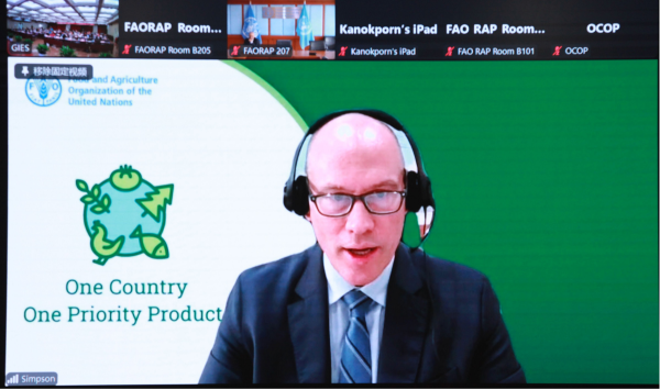 粮农组织亚洲及太平洋区域办事处的罗伯特·辛普森(Robert Simpson)先生在代表粮农组织助理总干事、亚太区域代表金钟真(Jong-Jin Kim)先生致辞时,介绍了“一国一品”实施的目的、意义与实施策略,表示全球已有85个国家申报支持54种特色农产品的绿色发展。其中,有22个国家来自亚太区域,通过“一国一品”倡议推广20种特色农产品。