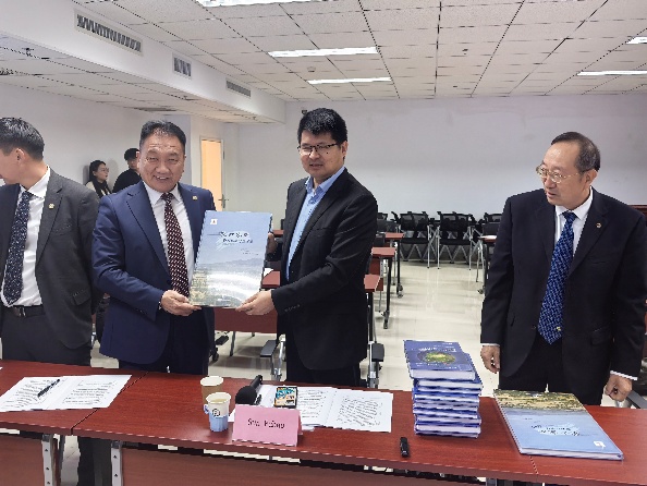 孙福宝在致辞中指出,近30多年来中国科学院地理资源所与蒙古科学院地理与地球生态研究所密切合作,在资源环境与可持续发展领域取得了显著成就,对蒙古科学院和地理与地球生态研究所的支持和积极参与表示感谢,未来将继续推进两国地理与资源科学家团结合作,争取更多成绩。孙福宝代表地理资源所向蒙古科学院院长赠送了中蒙俄经济走廊和蒙古高原丛书。周成虎指出,蒙古高原是应对全球气候变化的重要地理单元,中蒙两国合作历史悠久,合作研究前景广阔。研究所与蒙古科学院地理与地球生态研究所长期开展多次科学考察和合作项目研究,成果显著。全球气候变化对蒙古高原的区域性影响日益加剧,未来希望中蒙科学家携手运用3S、大数据、人工智能等新技术,加强对蒙古高原环境变化和可持续发展研究,造福两国人民。于伯华介绍了地理资源所发展历程和重点领域。Demberel Sodnsambuu表示,地理资源所所史馆的参观,令人印象深刻,地理资源所历史悠久、成就突出,研究人员多年来坚持不懈的开拓进取、辛勤工作、努力奋斗,使研究所不仅在中国进而在世界上都处于领先地位。中蒙两国地理与资源科学家开展了密切合作、关系良好、卓有成效。他对此次交流活动的国际化水平和中方研究给予高度评价,尤其对青年专家的创新性思路给予肯定和赞扬。未来,蒙古科学院将继续支持中蒙两国科学家深入合作,使资源环境和可持续发展研究成果增进两国人民福祉、促进共同繁荣。Tuvshintogtokh Indree表示,此次研讨会报告精彩、收获满满,她希望与地理资源所在生态系统服务、荒漠化防治、畜牧业等方面加强合作研究。