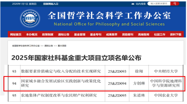 由方创琳研究员带领团队鲍超研究员、马海涛研究员、孙思奥研究员、王振波研究员申报的国家社会科学基金重大项目“国家城乡融合发展试验区实践创新政策优化研究”获批立项,项目编号为25&ZD094。这是方创琳研究员带领团队第2次成功申请到的国家社会科学基金重大项目,第1次成功申报的国家社会科学基金重大项目“中国城市发展空间格局优化理论与方法”是在2013年,并于2015年提前结题免检,当年成功入选国家哲学社会科学优秀成果文库,获国家哲学社会科学优秀成果最高奖(文库奖)。详见全国哲学社会科学工作办公室官网公告http://www.nopss.gov.cn/n1/2025/1219/c431028-40628359.html。