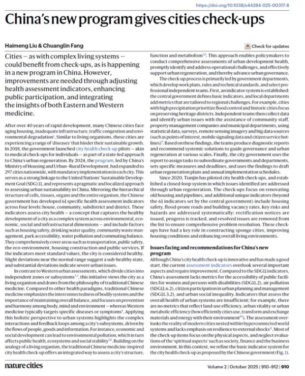 中国科学院地理资源所刘海猛、方创琳在Nature Cities发表评论文章,聚焦我国正在全面推进的城市体检制度创新,系统阐释其理念来源、运行机制、面临问题与国际启示,并进一步提出面向未来的“中西医结合”城市体检框架:以传统中医的整体观、平衡观与“治未病”思想为指导,以西医式的精准量化指标和快速处置能力为支撑,构建开放迭代、可诊断、可干预、可反馈的城市治理新范式。该研究不仅面向全球梳理了中国城市体检的模式与经验,更创新性提出中西医结合的城市体检框架,为推进城市现代化治理提供了方法论参考。研究得到国家自然科学基金创新研究群体项目和面上项目的支持。 论文信息:Liu Haimeng,Fang Chuanglin*. China’s new program gives cities check-ups. Nature Cities,2025,2,910–912. https://doi.org/10.1038/s44284-025-00317-8.原文链接:https://www.nature.com/articles/s44284-025-00317-8。报道链接:https://igsnrr.cas.cn/news/kyjz/202512/t20251219_8030397.html。
