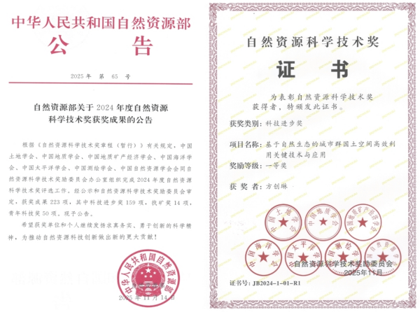 由方创琳研究员带领中国科学院地理科学与资源研究所团队鲍超研究员、杜云艳研究员、李广东研究员、马海涛研究员、王振波研究员、孙思奥研究员,联合自然资源部国土空间规划研究中心张晓玲研究员、中国城市规划设计研究院张兵教授级城市规划师、中国国土勘测规划院田志强研究员等单位专家共同完成的“基于自然生态的城市群国土空间高效利用关键技术与应用”获得2024年度自然资源科学技术奖一等奖。见自然资源部官方公告《自然资源部关于2024年度自然资源科学技术奖获奖成果的公告》(2025年第65号,2025年11月14日)。https://gi.mnr.gov.cn/202511/t20251124_2906500.html。