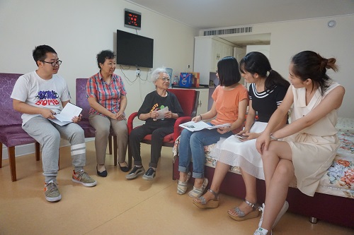 生活在敬老院的地理资源所离休干部孟力老人对大家的到来感到十分欢喜,兴致勃勃地聊起早年在抗日战争文艺前线的战斗经历。一行人与孟老一起合唱了《没有共产党就没有新中国》。激情澎湃的歌声似乎勾起了孟老年辈早年在文工团的回忆,老人脸上恢复了初见时的笑容。随后,孟老饱含深情地给大家独唱了《莫斯科郊外的晚上》,纯朴美好的意象,悠扬空灵的歌声让整个房间洋溢着温情和静谧。