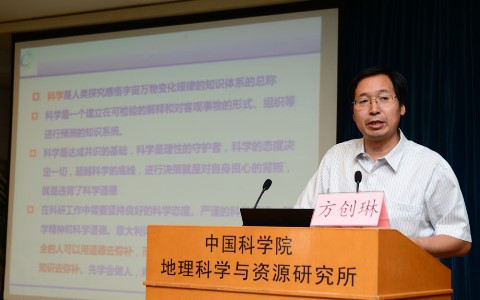 随后,方创琳研究员作题为《坚守科学底线,做好科研工作》的报告。他围绕五个方面作了精彩讲述。一是在国际规划中捍卫国家利益,始终把国家利益摆在首位。二是在国家规划中学会面向权力讲授真理,不做官场的学术附庸。三是面对诱惑不可心动,坚持科学公平公正原则。四是投身西部,科技兴边,为丝绸之路经济带建设尽微薄之力。五是加强合作,共建团队,用知识改变城市命运。