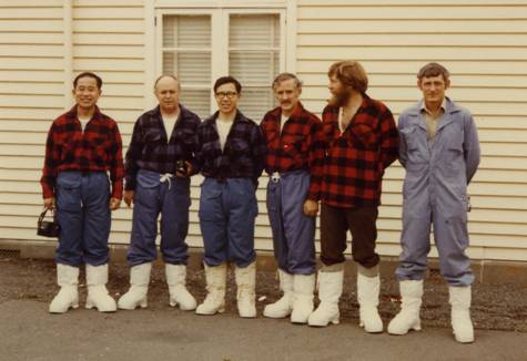1980年1月12日张青松(左3)董兆乾(左1)随澳大利亚南极局长C.McCue(左2),副局长K.Kerry(右2)等从新西兰基督城出发,飞往南极洲。