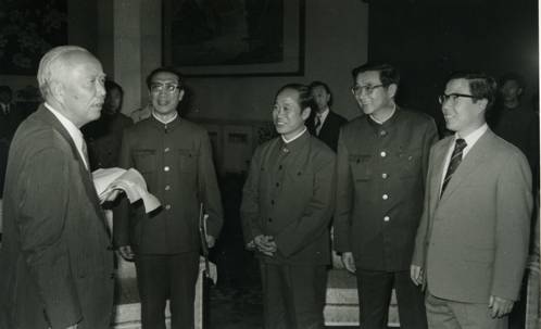 1984年10月,万里副总理(左1)和胡启立同志(右2)代表国务院和中共中央接见即将出征的中国首次南极考察队,郭琨(左2)、董兆乾(左3)张青松(右1)参加。