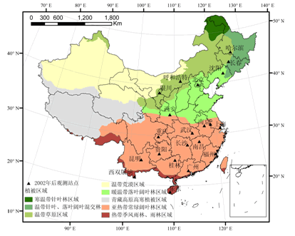 第三,与国外物候学能力建设程度和规模相比,国内物候观测手段还有很大的局限性。中国物候观测网建立于1963年,到20世纪90年代初,因经费紧缺,系统的物候观测陆续停止,1996年则全面停止观测。数据中断直接导致物候研究基本停滞。而且数据序列不完整性将长期影响今后的研究工作。虽然自2002年起,笔者自筹经费使“中国科学院物候观测网”部分恢复工作,直接带动了近年国内物候研究。但因经费限制,目前全国仅恢复了21 个站点,覆盖范围和资料数量都不及20世纪60-90年代的观测网络,限制了我国物候学向更高水平的发展。在中国植被区划图上,有的植被区域甚至没有一个观测站点(图2),无疑给以后的科研工作带来消极影响。