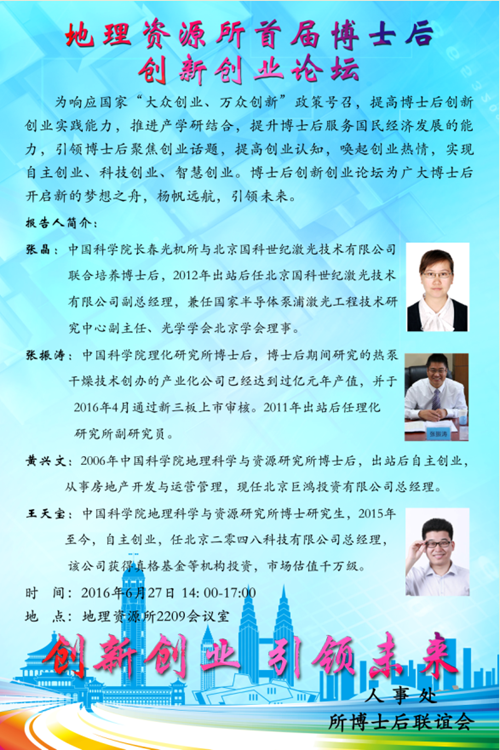 为响应国家“大众创业、万众创新”的号召,提高博士后创新创业、服务经济社会发展能力,探索“研究型、创新型、创业型”三位一体的博士后人才培养模式,推进产学研结合,地理资源所定于6月27日举办首届“博士后创新创业论坛”。论坛特邀创新创业优秀者展开交流与对话,引领博士后聚焦创业话题,提高创业认知,唤起创业热情,实现自主创业、科技创业、智慧创业。论坛将为广大博士后开启新的梦想之舟,扬帆远航,引领未来。