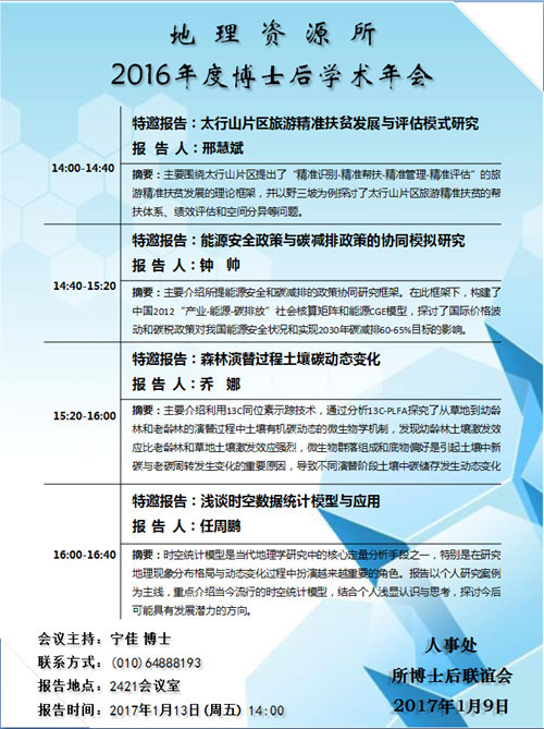 为加强我所博士后科研人员之间的学术交流,博士后流动站与所博士后联谊会定于2017年1月13日举办地理资源所2016年度博士后学术年会,欢迎各位博士后踊跃参加。现将有关事项通知如下: