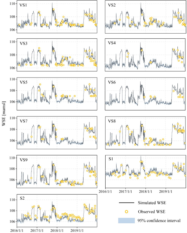 图2.新方法反演的黄河伊洛河下游水位及水动力模型率定后的模拟水位