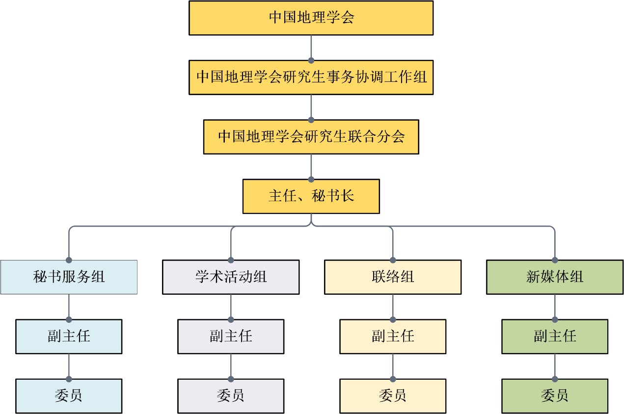 目前,中国地理学会研究生联合分会共有正式委员47人(委员单位47 家),均为中国地理学会学生会员。分会接受中国地理学会研究生事务协调工作组的指导和监督,由主任、秘书长、副主任负责工作统筹规划,各类工作以副主任分管执行、主任和秘书长对接协调、委员协作沟通的形式组织开展。分会下设秘书服务组(以年度履职考评工作为牵引,积极完善组织规章制度,做好资料归档和工作过程考核的工作)、学术活动组(聚焦地研联论坛等学术交流品牌活动,建设运营中国地理学会学生会员及学术交流社群,为全国地理学子提供直接面对面的学术交流机会)、对外联络组(基于硕博考研分享会、就业分享会等活动,根据全国地理学子不同阶段的现实需求提供助力,积极调动和整合各高校资源,推动合作,创新地理人前辈专访活动,积极宣传、发展学生会员,组织系列会员活动,为学生会员提供优质会员服务)、新媒体运营组(对接中国地理学会新媒体团队,继续优化运营地研联微信公众号,着力打造地理学领域学术信息共享平台和原创内容输出平台)在内的四个职能部门。