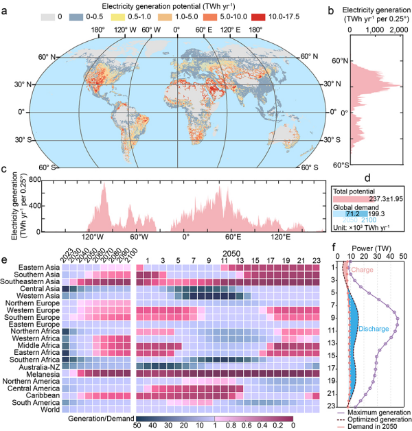 作者系统评估了全球互联的太阳能-风能系统在满足未来电力需求方面的可行性与效益。通过整合高分辨率空间(500 米)和时间(每小时)数据,全面评估了考虑太阳能和风能可开发性、可获取性和互联性的全球潜力。通过开发多目标空间优化框架,确定了具有成本效益和资源效率的互联战略,提供了有关太阳能-风能发电厂的空间分布与部署时间、储能和输电能力的区域分配,以及全球互联的潜在效益和风险的宝贵见解。该工作推动了对全球能源互联的更细致理解,并为实现这一愿景提供了具体的可参照的实现路径。