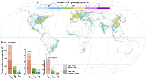 图 1. 全球建筑立面光伏潜力空间分布及不同情景下的碳减排潜力
